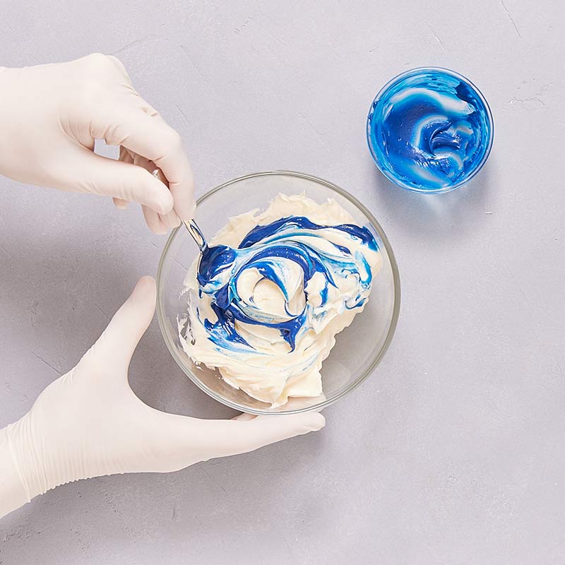 Die Mengenangaben beziehen sich auf 400g Buttercreme. Diese Menge reicht für ca. 12 Cupcakes oder das Einstreichen einer Torte mit 26cm Durchmesser. Sollte die Torte auch mit der Buttercreme gefüllt werden, dann sollte man die doppelte Menge an Buttercreme machen. Unsere Pulverfarben werden in 10g Verpackungen geliefert. Dabei entsprechen 10g ca. 4TL.